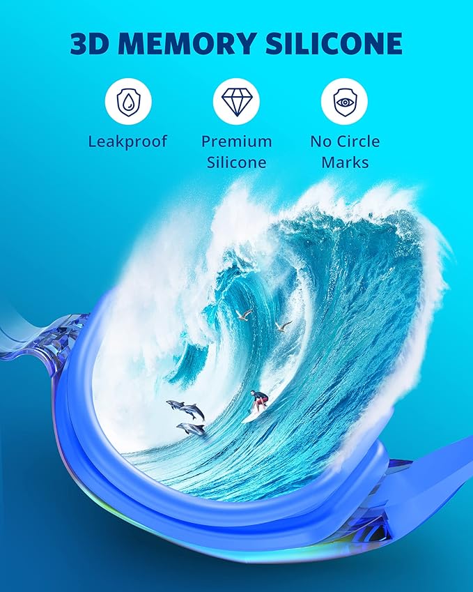 - Great Seal & No Leaking-The ergonomic design of swim goggles with high-quality silicone material ensures a close fit to different face shapes and never allows leakage. In addition, the flexible silicone frame and improved higher nose rest provide extreme comfort and will never hurt your nose or leave marks on your face.