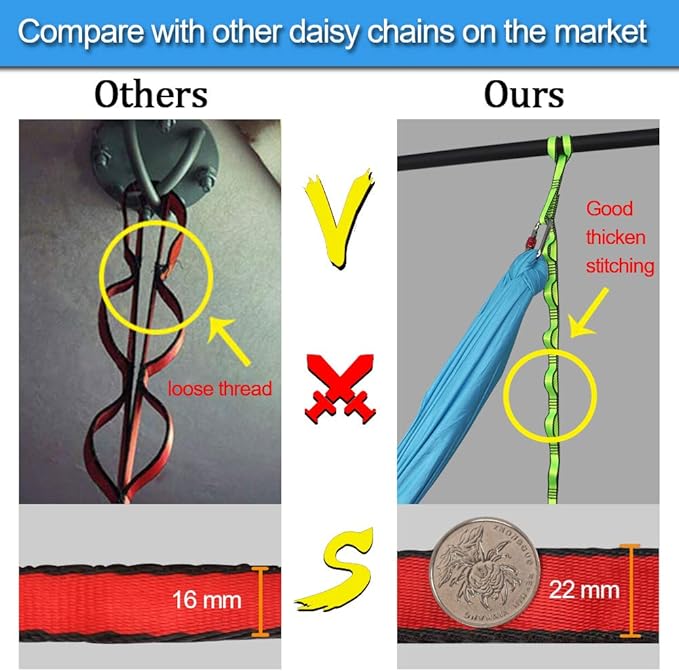 - The daisy chain is not only for climbing, but also for camping(you can attach carabiners to the loops and then hang your outdoor tools with the loops. When on camping trips, you can hang hammocks and or swings with it)