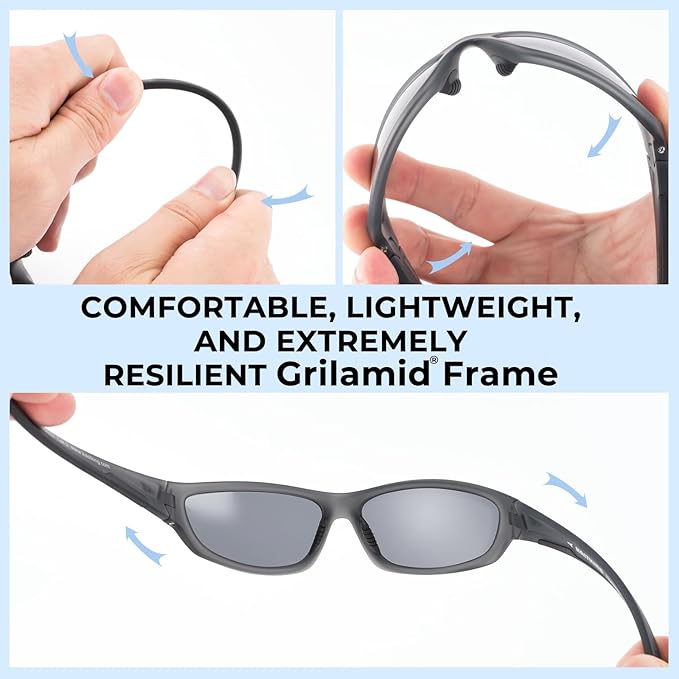 • KEY FEATURES - Polarized lenses reduce glare - Impact resistant TAC lenses protect your eyes from flying objects - Lightweight, durable, and comfortable Grilamid frames – Anti-slip nose and temple pads - Block 100% of the harmful UVA and UVB rays