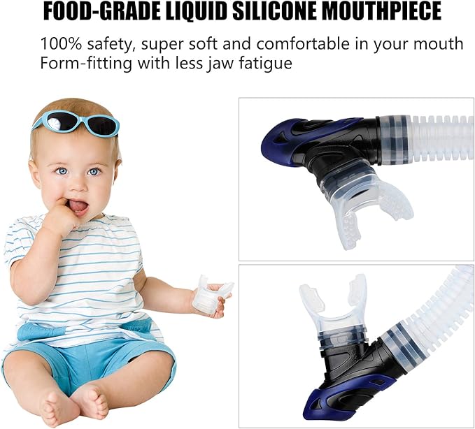 - Advanced Dry Valve and Splash Guard: The innovative dry top valve automatically seals when submerged, effectively blocking water entry. The splash guard further protects against waves, while the advanced design prevents clogging from sand or debris, ensuring consistent and comfortable breathing.
