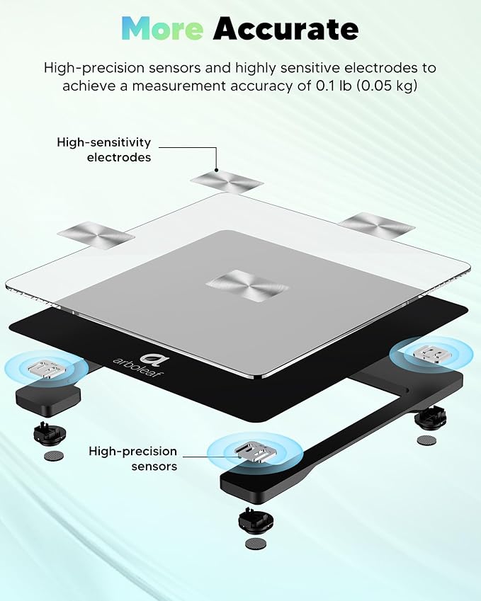 - Advanced BIA Technology for Deeper Insights: Equipped with BIA technology, 4 high-sensitivity electrodes, and 4 high-precision sensors, the Arboleaf smart scale delivers accurate, consistent readings of weight, body fat, muscle mass, and more—down to 0.1 lb / 0.05 kg