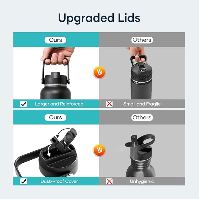 • 2 Caps Pack: This 32 oz stainless steel water bottle comes with straw lid and flex cap, the flex cap is perfect for the beach, camping and hiking, while the straw lid is suitable for cycling and road trip