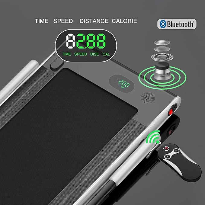 - WITH APP CONTROL, BLUETOOTH SPEAKER, PHONE HOLDER & REMOTE CONTROL β APP control is perfect to record exercise data. Connect the treadmill to your phone through Bluetooth, so you can play music while you are exercising. You can also use the phone holder to watch videos or chat with friends. The remote control (BATTERY NOT INCLUDED) is convenient to adjust the speed of movement and stop instantly. Equipped with a safety key to shut down immediately in an emergency to protect your safety.