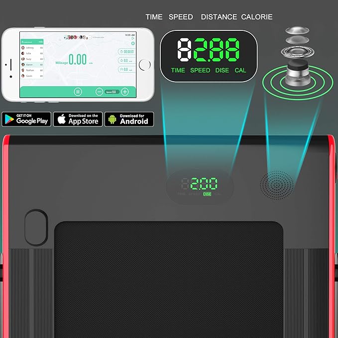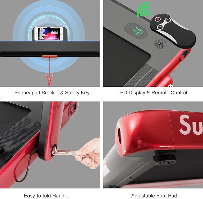 - 【Spacious Running Belt & LED Display & Phone Bracket】 Excellent load-bearing capacity together with the wide and non-slip running area will improve safety during your workout. The LED display helps you clearly see your movement time, speed, distance and calories. Besides, the phone holder allows you to exercise while entertaining.