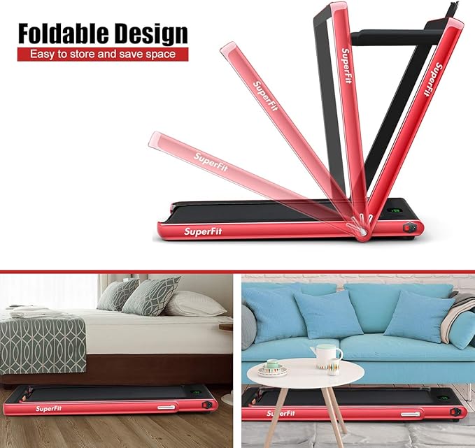 - 【Easy to Install, Move or Store】Installation-free design saves you time and energy. The wheels on the front of the treadmill can facilitate you to move it around. And you can fold it into a compact size to store it under your bed or sofa. And the treadmill has passed CE, ROHS, CB, EN957, IEC certifications by SGS. Please do not use the treadmill on carpet to avoid overheating