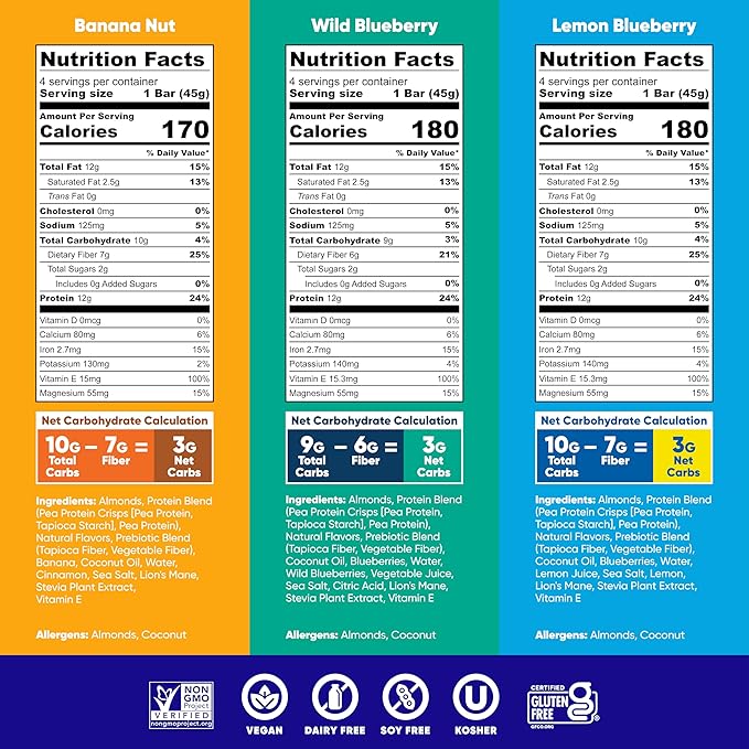 - KETO FRIENDLY SNACKS w/ Only 2-3g Net Carbs in Every Serving - Net carbs are carbs that are absorbed by the body, and our keto treats come with only 2-3g of net carbs in every serving. Each keto plant based protein bar is packed with 9-12g of total carbs, 6-9g of fiber, 10-13g of fats & 160-180 calories. Enjoy our 6 flavors Chocolate Sea Salt, Peanut Butter Chip, Almond Butter Chip, Lemon Blueberry, Banana Nut, Wild Blueberry