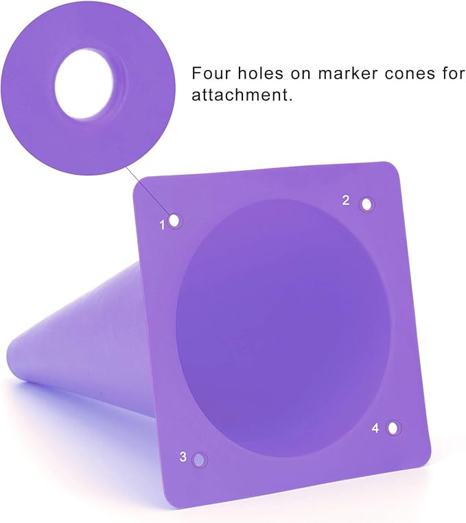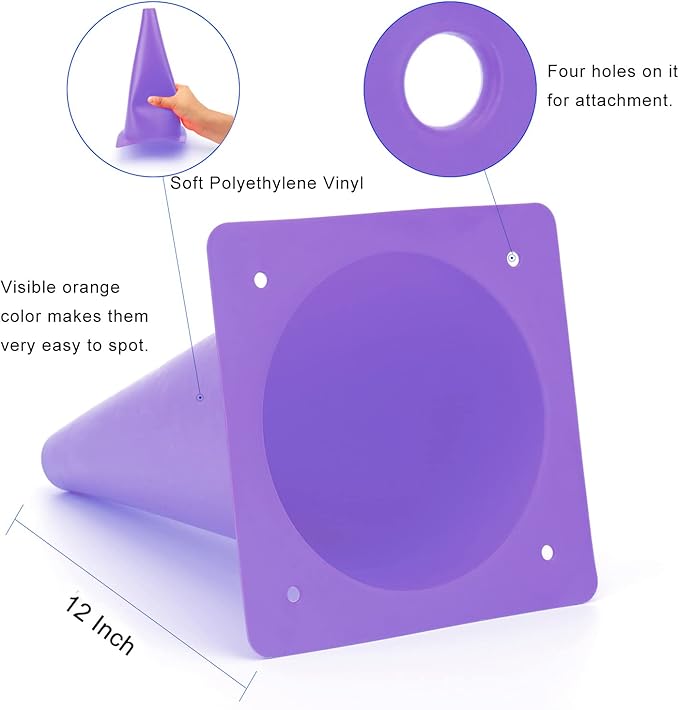 • Size - measures 12 inches in height, 6.7 inches in diameter. Four holes on safety cones for attachment, if it is a windy day, you do not need to worry it will blow all over the place.