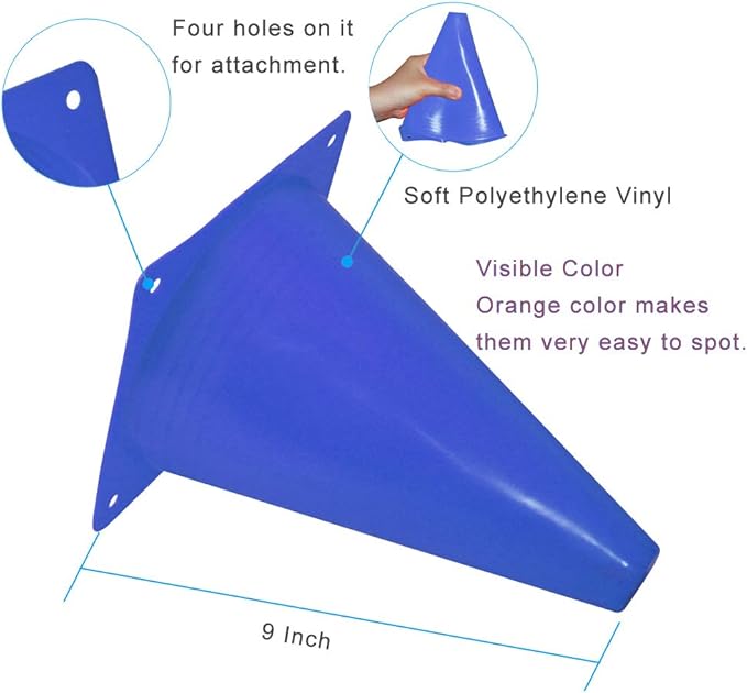- Size - measures 9 inches in height, 5.5 inches in diameter. Four holes on marker cones for attachment, if it is a windy day, you do not need to worry it will blow all over the place.
