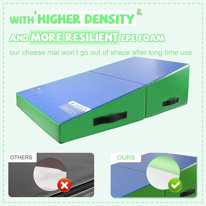 - FOLDABLE DESIGN WITH 4 HANDLES, EASY TO CARRY & STORE: Each side and every handle with excellent craftsmanship will never unravel. Simply turn the gymnastics mat from a cube to a wedge or from a wedge to a cube by opening and folding it. You can take the incline mat with you to the backyard, park, or gym and store it at any place in your house when not in use.