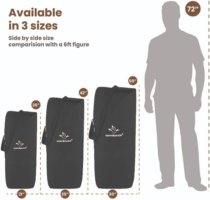 - 【Available in 3 Sizes & 5 Colors】Choose from 3 sizes: Standard Size: 36" x 10" x 10", 36" (Height) x 10" (Base Width) x 10" (Depth) | 21" Flat Width (59L), Large Size: 42" x 12" x 12", 42" (Height) x 12" (Base Width) x 12" (Depth) | 25" Flat Width(99L), and Extra Large Size: 50" x 15" x 15", 50" (Height) x 15" (Base Width) x 15" (Depth) | 30" Flat Width (184L), offering ample space for any gear or equipment. Whether you need an extra large duffle bag for travel or a mid-sized bag for daily use.