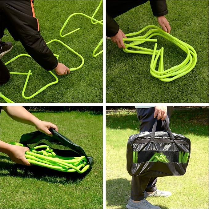 - HIGH VISIBILITY: Whether you're training indoors or are out on the field, pitch, or court, these brightly green colored speed agility training hurdles ensure easy visibility. Now you can comfortably run agility drills even on the most overcast of days.