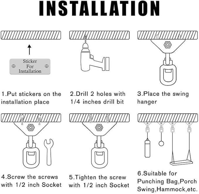 - Widely used in WOOD and CONCRETE : Our swing hardware provides 2 SCREWS for WOOD and 2 EXPANSION BOLT for CONCRETE, Perfect for Ceiling, Punching Bag, Porch Swing, Hammock, Swing Chair, Ring, Yoga Swing, Boxing Equipment, etc.