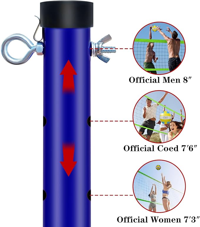 - Official size volleyball net: 32ft x 3ft, 𝐇𝐞𝐢𝐠𝐡𝐭 𝐀𝐝𝐣𝐮𝐬𝐭𝐚𝐛𝐥𝐞 𝐏𝐨𝐥𝐞𝐬 for this volleyball net set, easy conversion for the height design. 8' for men, 7.6' for co-play, and 7.3' for women. And set up height of 5.1‘ for badminton game, professional level net; come with durabel guideline and 4 steel stakes to fully support its stability