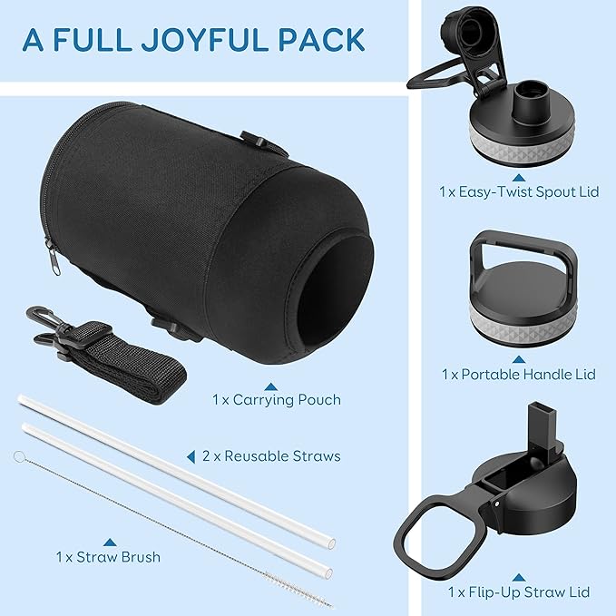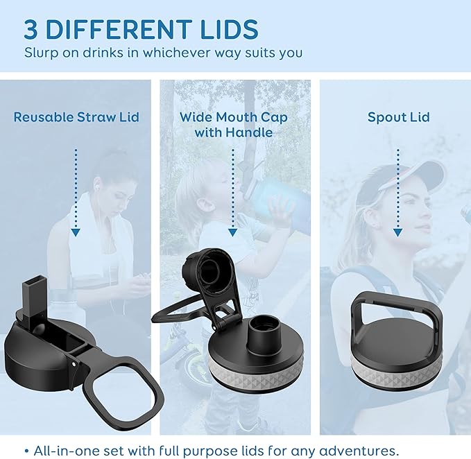 - Flexible Drinking On-the-Go: This water jug comes with 3 different lids. The screw-on lid with flip-up handle is for easy ice refilling with superior portability; spout lid makes it convenient to drink hot liquid and straw lid for sipping cold.