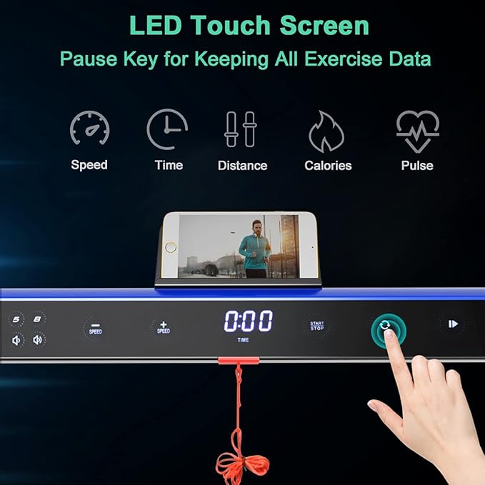 - š¦š¶šŗš½š¹š² š¢š½š²šæš®šš¶š¼š»: This under desk treadmill features LED touch screen, offering real-time feedback of calories, pulse, time, distance and speed. The treadmill could also be control and adjust via App and remote. Furthermore, all sports data will be kept when you press the pause key for water break and you can switch speed unit between mile and km in APP.