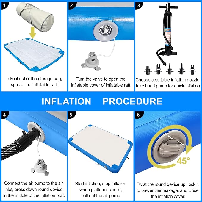 - 【COMPLETE SET】 Comes with inflatable dock swim platform, a hand pump, white carry bag, 1 patch kit (including Inflation port wrench), 4 stainless steel heavy duty anchor D-Rings tie downs, 6 soft neoprene reinforced handles, and 1 high pressure inflate/deflate HR valve.