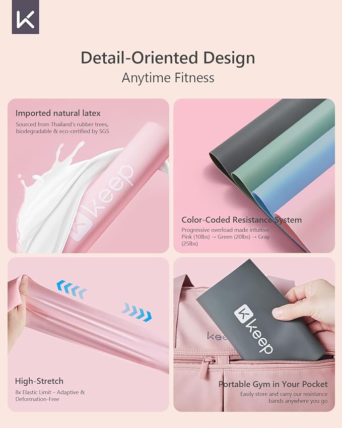 - Tailored for Every Fitness Stage: A distinct color to represent a specific resistance level: Pink for 10 lbs, Green for 20 lbs, and Gray for 25 lbs. This color-coded system allows for a gradual, tailored approach to your workouts, helping you progress at your own pace. Whether you're just starting out or advancing to more challenging exercises, our bands are designed to match your training needs, ensuring a professional and effective workout experience