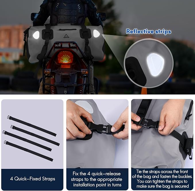 - Safety: The motorcycle duffle bag contains a total of 4 high brightness reflectors, which can provide you with good security protection for night travel. Comes with a shoulder strap and hand strap, you can carry it by hand or crossbody