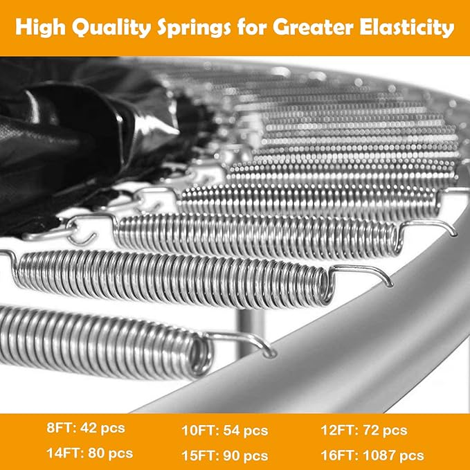 - Easy Installation & Convenient Use: With the installation manual included in the package, you can assemble the trampoline effortlessly. We provide you with six different options (8/ 10/ 12/ 14/ 15/ 16 FT with 42/ 54/ 72/ 80/ 90/ 108 PCS high-extension and rust resistant springs) for choice to satisfy various requirements. Besides, the ladder is equipped with a 2-step ladder for easy access to inner space.