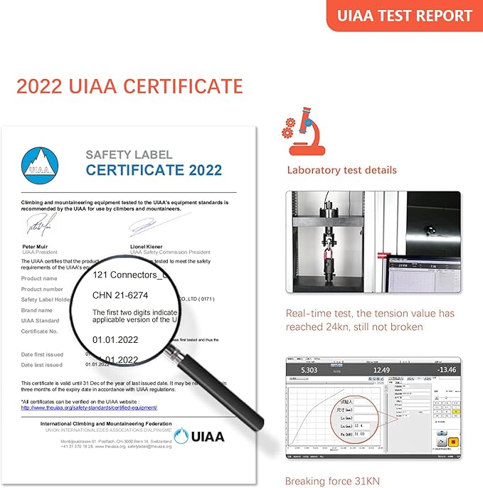 - ☪ Strong But Lightweight Oval Carabiner ✔☪ Major axis: 25KN (about 5500lbs), Minor axis: 8kN, Open gate: 7kN.There is a detailed tensile test in the video, you can see that our product is only broken under the tensile force of 30.55KN (about 6869 lbs).