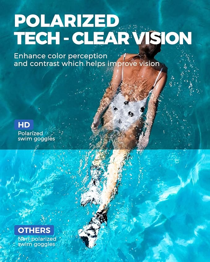 - 【Polarized Swim Goggles】The polarized swimming goggles will reduce light glare and eyestrain, ensuring a better eye protection for outdoor swimming. You can become frustrated and even temporarily blinded by reflected light and glare. This is a potentially dangerous situation that polarized lenses can prevent.