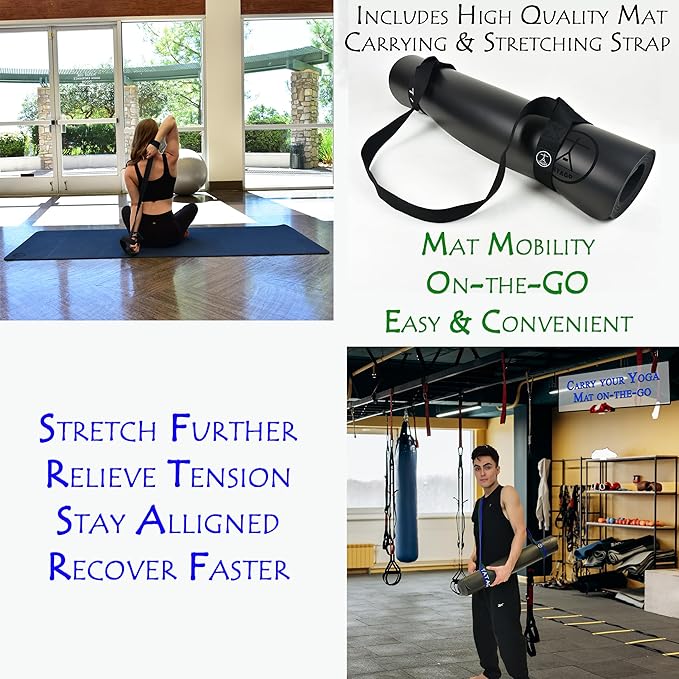 - INCLUDED YOGA MAT WITH STRAP-A professional yoga strap for carrying, stretching and storage of the exercise mats at home gym. A tough yoga mat strap, just like the mat!