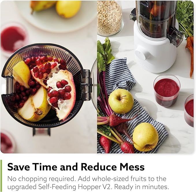 - LESS PREP, MORE TIME: Features an upgraded self-feeding hopper that fits whole-sized fruits. Plus, it has a quiet motor, is 100% BPA free with no blades or sharp parts, and is small and lightweight, so it takes up little space and puts no strain on the hands.