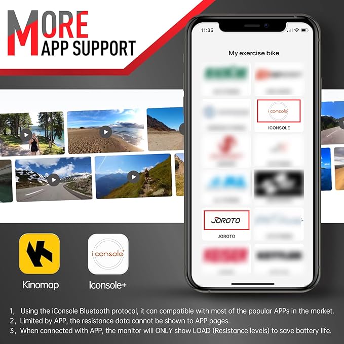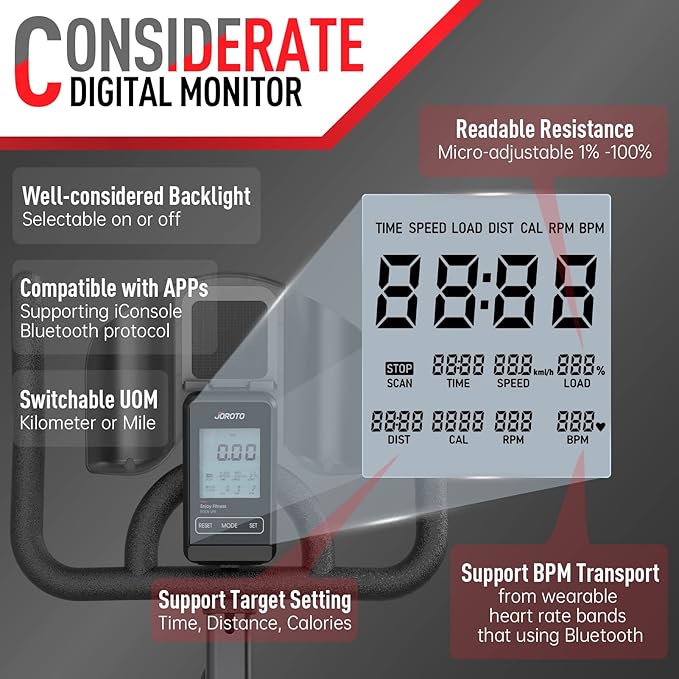 - 【Own-developed Bluetooth Digital Monitor】- This stationary bike’s monitor is Bluetooth & Backlight, shows time, distance, speed, RPM, load (Readable Resistance Levels: 1% to 100%), calories, and BPM (If connected with wearable heart rate bands). You can have total control over the pace and duration of your riding. The Bluetooth connectivity to 3rd-party apps allows you to follow structured workouts or ride a route. So your fitness or weight loss journey can be specific in meeting your needs.