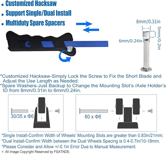 - 【Support Single/Dual Wheels】Please First Ensure the Height & Width of Single Wheels’ Mounting Slots are greater than 0.83in/21mm,or Confirm the Axle Holder in the Middle of the Dual/Spinner Wheels is 0.4-0.7in/10-18mm Thick,and then Choose Right Wheels Following the Size Chart.