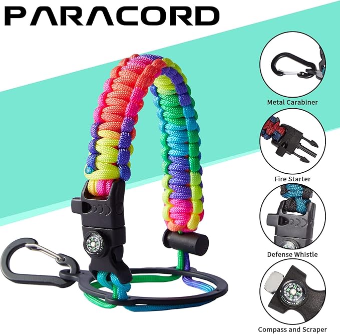 - UNIQUE DESIGNS PARACORD HANDLE: Full-function paracord handle made in individual styles to match the color of the flask water bottles. With compass, safety ring, carabiner, flint fire starter & whistle. It unravels into a sturdy and taut rope in an emergency, making the large water jug an ideal survival kit for expeditions in the wild