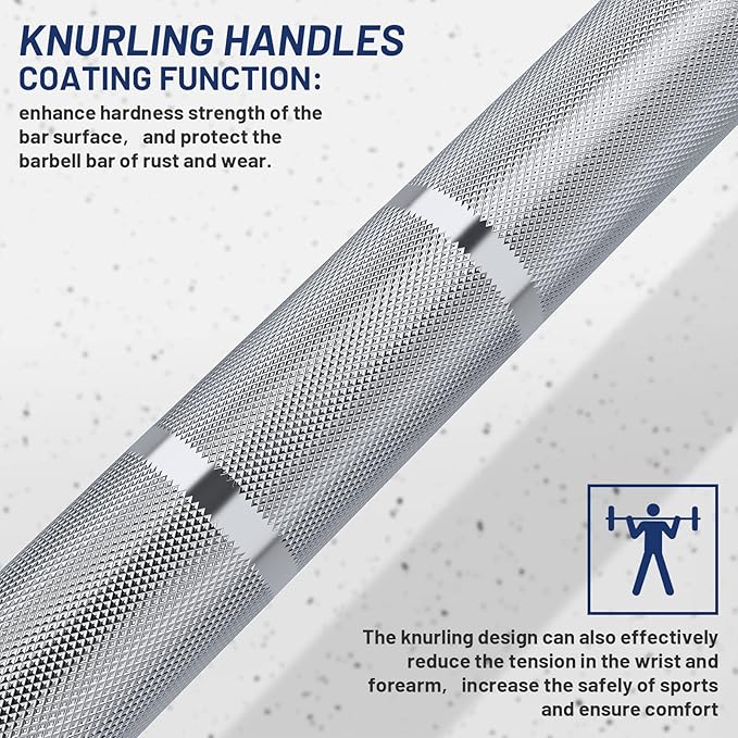 - Enhanced Grip with Precision Knurling: Designed with a 28mm shaft and 1.2mm medium-depth knurling, this barbell offers superior grip and wrist comfort. Whether you're lifting for strength, powerlifting, or general fitness, the knurling reduces slippage and strain—ideal for safe and consistent lifts