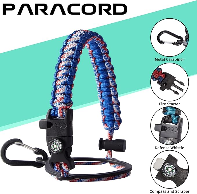 - UNIQUE DESIGNS PARACORD HANDLE: Full-function paracord handle made in individual styles to match the color of the flask water bottles. With compass, safety ring, carabiner, flint fire starter & whistle. It unravels into a sturdy and taut rope in an emergency, making the large water jug an ideal survival kit for expeditions in the wild