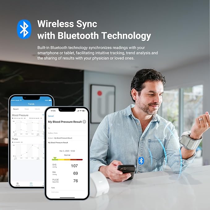 - Effortless Data Syncing: Built-in Bluetooth syncs readings to our free app for easy tracking, storing, and sharing with doctors. Monitor stores 99 readings, app stores unlimited data.