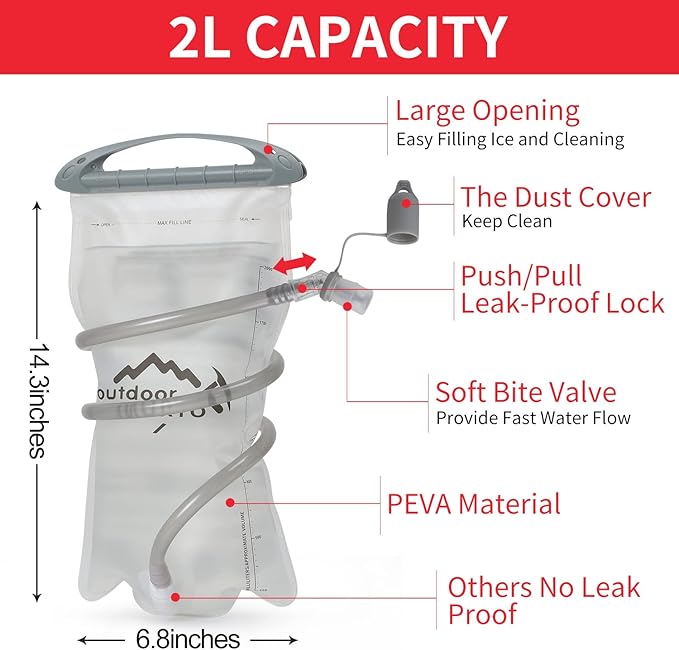 - đ´âăPremium Quality Water BladderăThe Hydration Pack Backpack comes with a 2 liter hydration water bladder and two 250ml soft flask. A switch valve and a cover cap make double leak-proof. Large opening allows quick filling of water and ice and it is easy to clean, the water line (40"length,0.4"diameter) provides a wholesome flow for easy drinking keeps your water tasting fresh, all day. The water temperature is range -20~+50â.