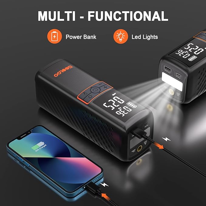- 【Ultra-large LED Screen】The GOOLOO GT160 tire inflator portable air compressor for car tires has a large LED digital display screen with 3 pressure measurement units- PSI, KPA, BAR. Super bright LED with 2 lighting modes (lighting and strobe) makes your portable car tire pump suitable for roadside emergency and night time use.