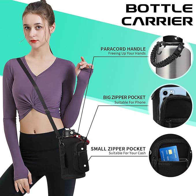 - PROTECTIVE BOOTS & STORAGE SLEEVE: Upgraded silicone boots prevent shattering and cracking when stainless steel water bottle accidental dropped. And storage carrying pouch with removable shoulder strap for convenient hands free carrying! The safe zippered pocket design to stores all your stuff, holds your cards & phone & key