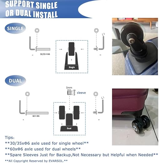 - Widely applications:Fix for most luggage suitcase/trolley case/duffle bag/drawbar box with damaged/jammed/rubber worn wheel replacement repair,but also for replacing inline roller skate wheels
