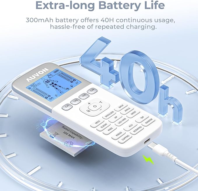 - Bigger Battery, 2X Battery Life. No worries about usage interruption for dead AAA batteries any more! It has a 300mAh rechargeable battery to last up to 40h standby time, which beats other TENS with 180mAh by 20h. (Charge it with your wall charger, power bank or laptop using the included Type-C cable)