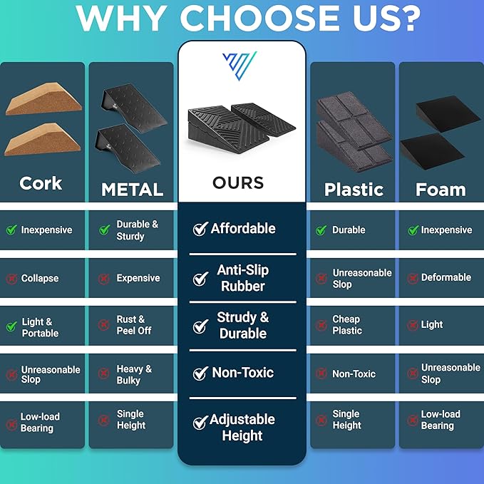 - šŖ 4PCS adjustable slant board system includes four rubber wedges to create 3 incline levels (9°, 13°, 22°) for strength, flexibility, and squat depth. Works as a heel elevated squat wedge, squat wedge board, or calf raise block to improve dorsiflexion and lower-body mechanics.