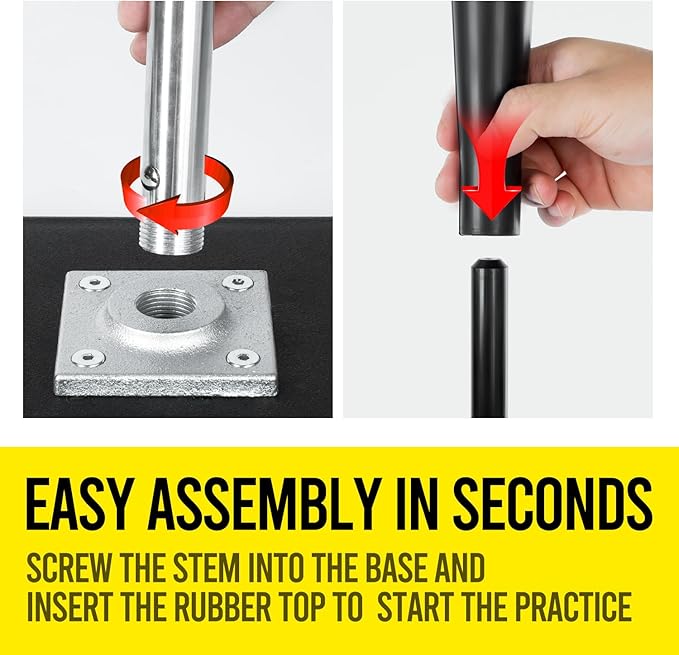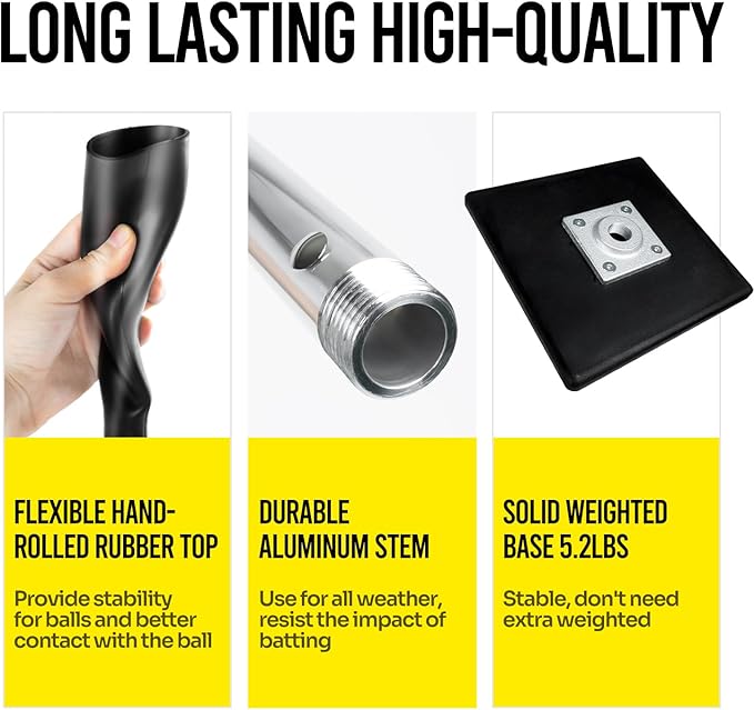 - ⚾【Durable Batting Tee】The one-piece baseball tee is made of durable metal and rubber parts. sturdy solid metal base weighs 5.2LB, 9 inches wide can withstand strong impacts and provide stability for every swing, flexible rubber top allows you to make better contact with the ball.