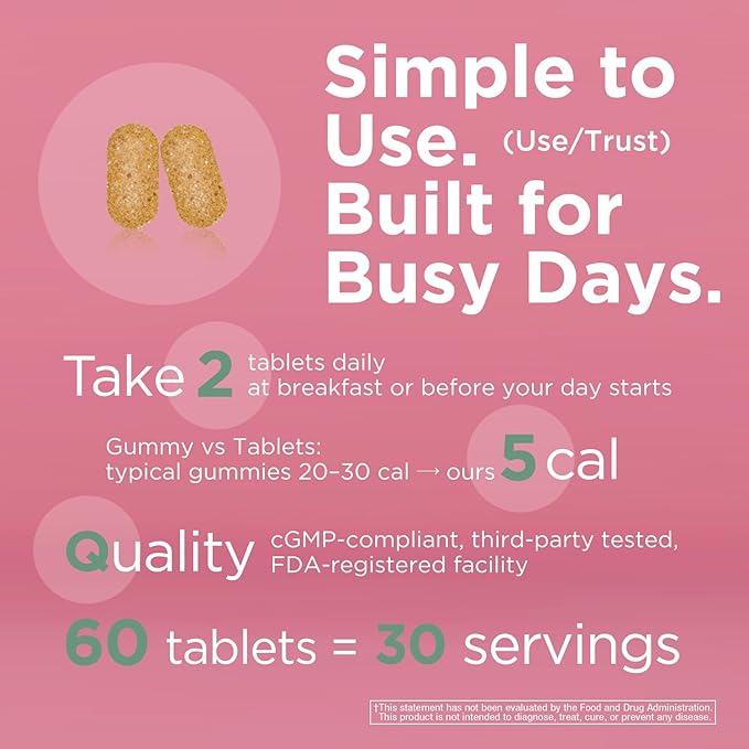 - MADE FOR YOUR MORNING ROUTINE: 2 tasty tablets, 30 servings per bottle. A simple, feel-good way to start the day and stay on track—ideal for women and men with busy schedules.
