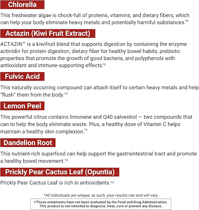 - ACHIEVE RADIANT SKIN: Chlorella, lemon peel, and kiwi fruit extract work together to eliminate skin-aging compounds and support a healthy skin complexion. Fulvic acid helps remove harmful heavy metals that can contribute to premature visible aging, while chlorella's high protein content helps promote skin firmness.*