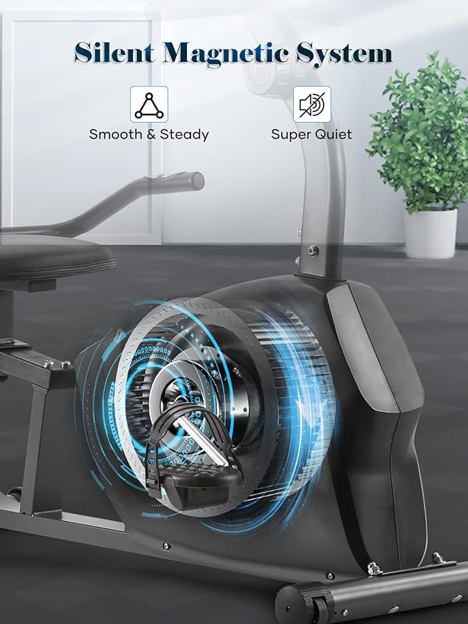 • 8 Level Magnetic Resistance: With 8 levels of resistance this recumbent exercise bike gives you different exercise intensity options, giving you the flexibility to tailor your workout to your fitness level.The recumbent exercise bike is ideal for casual ride. The movement that engages the whole body, virtually anyone to start a comfortable and low-impact workout, especially seniors and deconditioned people