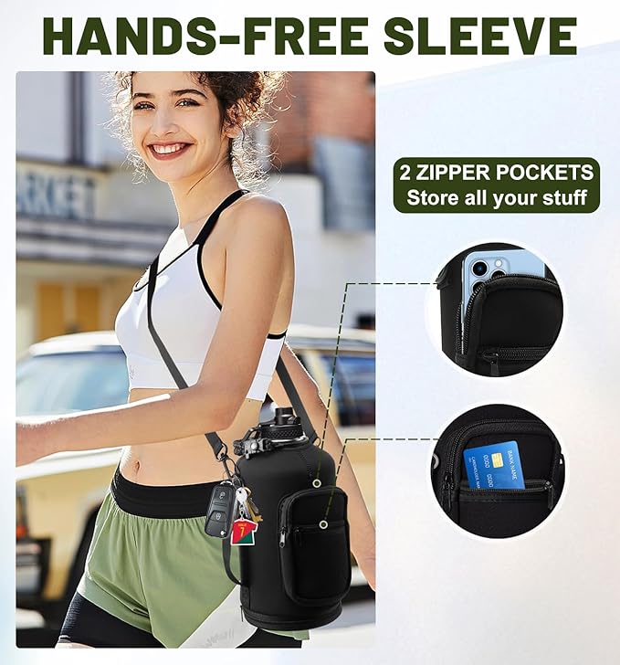 - PROTECTIVE BOOTS & STORAGE SLEEVE: Upgraded silicone boots prevent shattering and cracking when stainless steel water bottle accidental dropped. And storage carrying pouch with removable shoulder strap for convenient hands free carrying! The safe zippered pocket design to stores all your stuff, holds your cards & phone & key