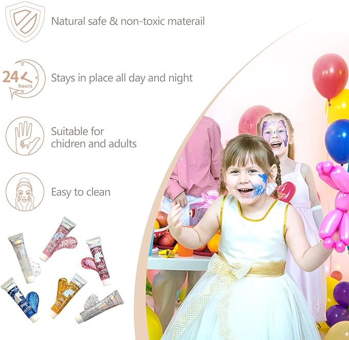 - 【6 Colors Body Glitter Gel Available】Our holographic body glitter are rich in 6 colors available:White,Silver,Gold,Pink,Blue,Red. very shiny and dazzling, and every Angle of the glitter is a different color, like a chameleon. and will show different effects under bright and dim lights. when the lights are bright, skin glitter are beautiful and shiny.when the lights are low, skin glitter also has a shimmering effect, which will make your skin sparkle in the dark and add to your charm