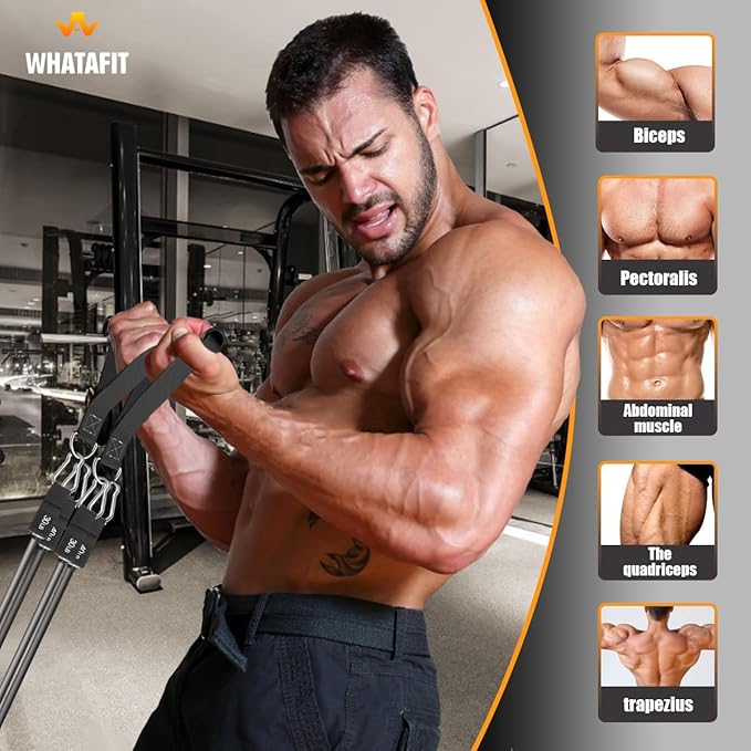 • Adjustable Resistance Bands: WHATAFIT exercise bands come with 5 different resistance level 10lbs, 20lbs, 30lbs, 40lbs and 50lbs in 5 different colors. You can use the bands You can use it independently or in combination, up to 150 lbs