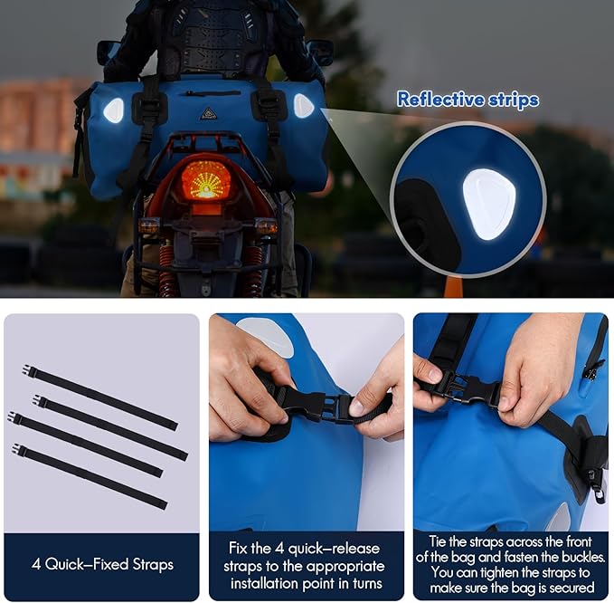 - Safety: The motorcycle duffle bag contains a total of 4 high brightness reflectors, which can provide you with good security protection for night travel. Comes with a shoulder strap and hand strap, you can carry it by hand or crossbody