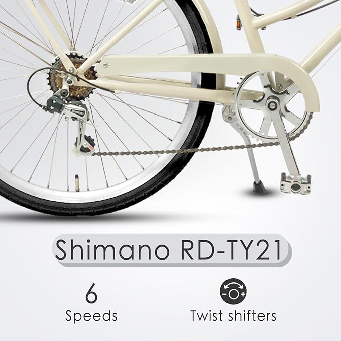 - 🚴♀️【Women-Centric Ergonomic Design】Crafted for female proportions: A low-step high-carbon steel frame enables easy mounting, while the swept-back handlebars promote upright posture (reducing back strain). The brown synthetic leather saddle with shock-absorbing springs combines vintage aesthetics with modern comfort.