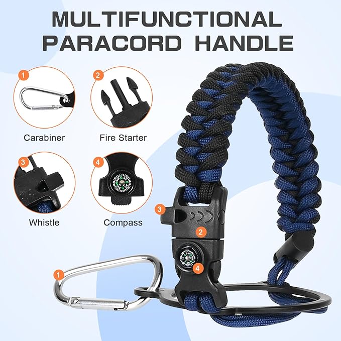 - Full-function Paracord - With brilliant matching colors brings a touch of youthful vibe to the jugs. As a sturdy survival handle it comes with a carabiner, compass, fire starter and whistle, perfect for your wild adventures.