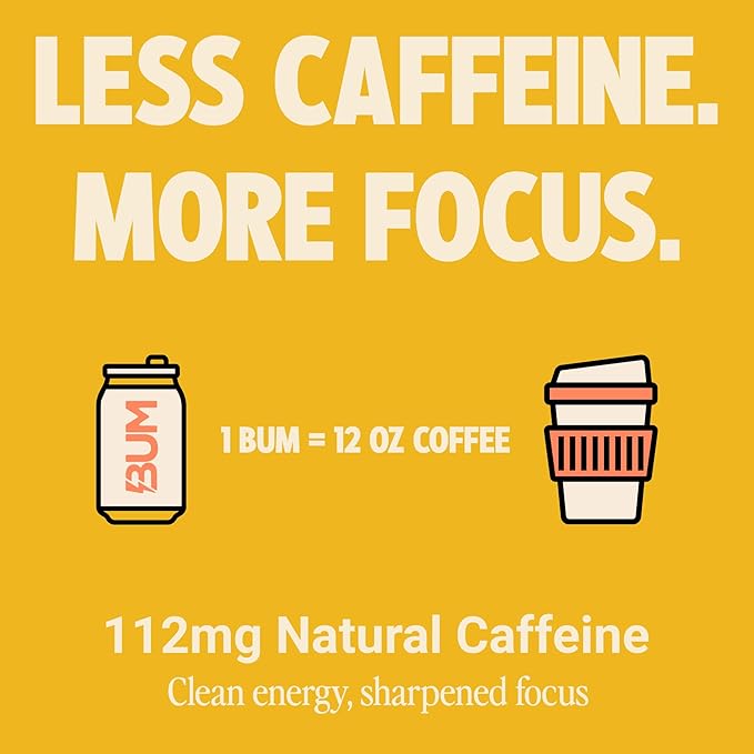 BUM Sugar-Free Energy Drink, Peach Mango - Lightly Carbonated & No Artificial Colors, Natural Caffeine & Citicoline for Energy & Focus, Brain Boost & Workout Sports Beverage - 12 oz, Pack of 12